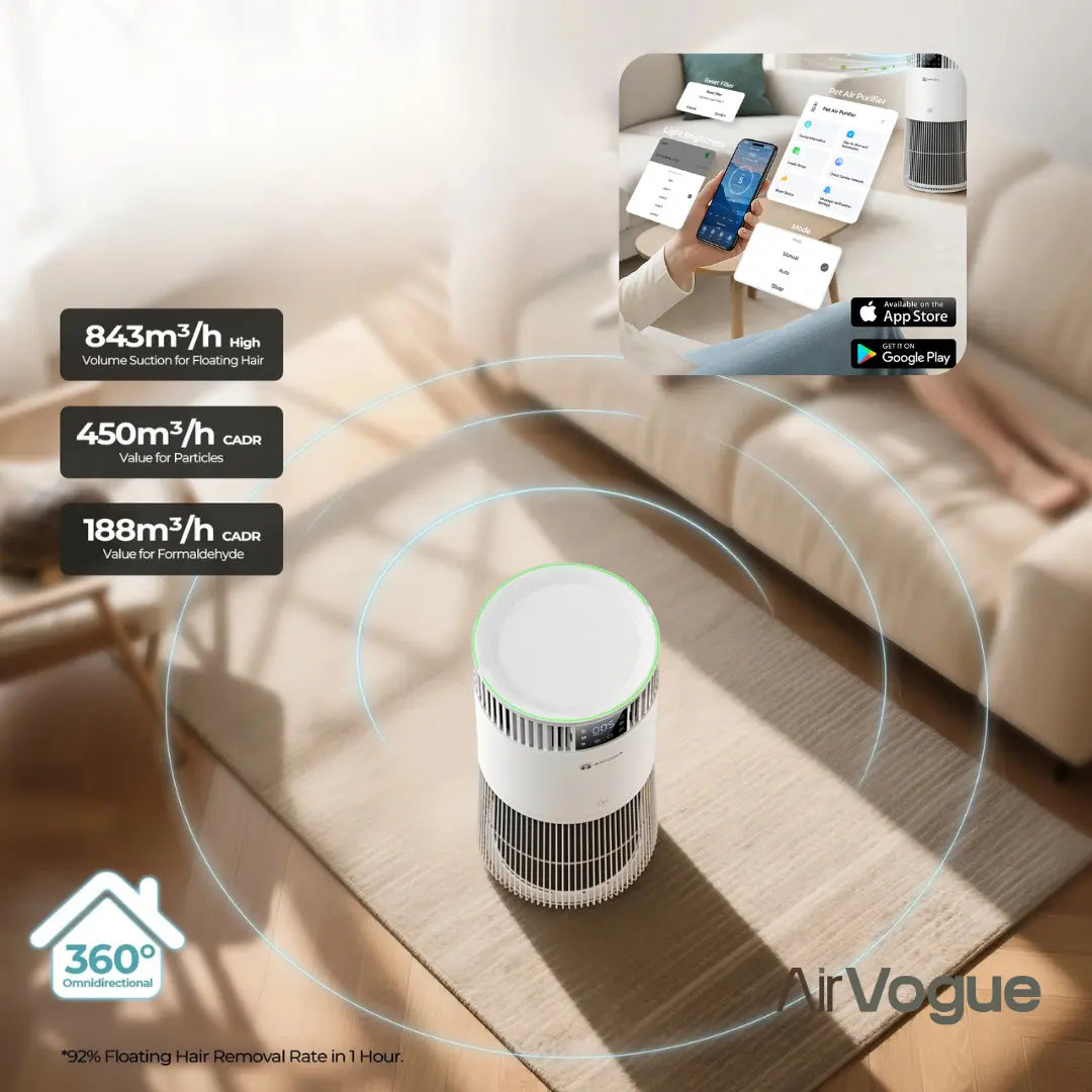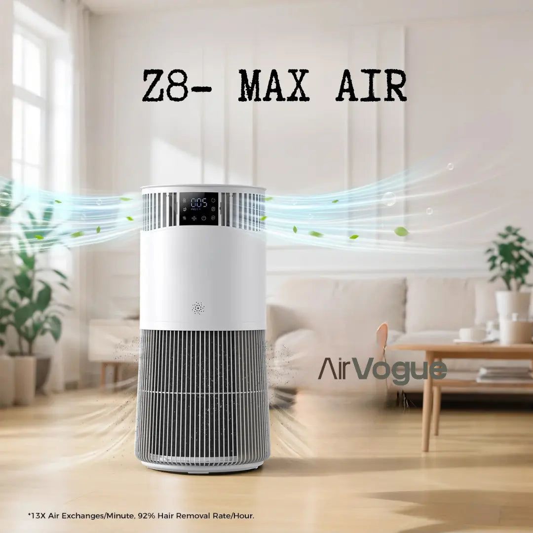Le AIRVOGUE Z8 – Max Air est un purificateur d’air grand débit conçu pour les intérieurs où les allergènes, les odeurs et les particules liées aux animaux s’accumulent rapidement. Son débit annoncé jusqu’à 843 m³/h associé à un CADR 450 permet de traiter plus efficacement les grandes pièces, sans attendre des heures pour ressentir une amélioration.